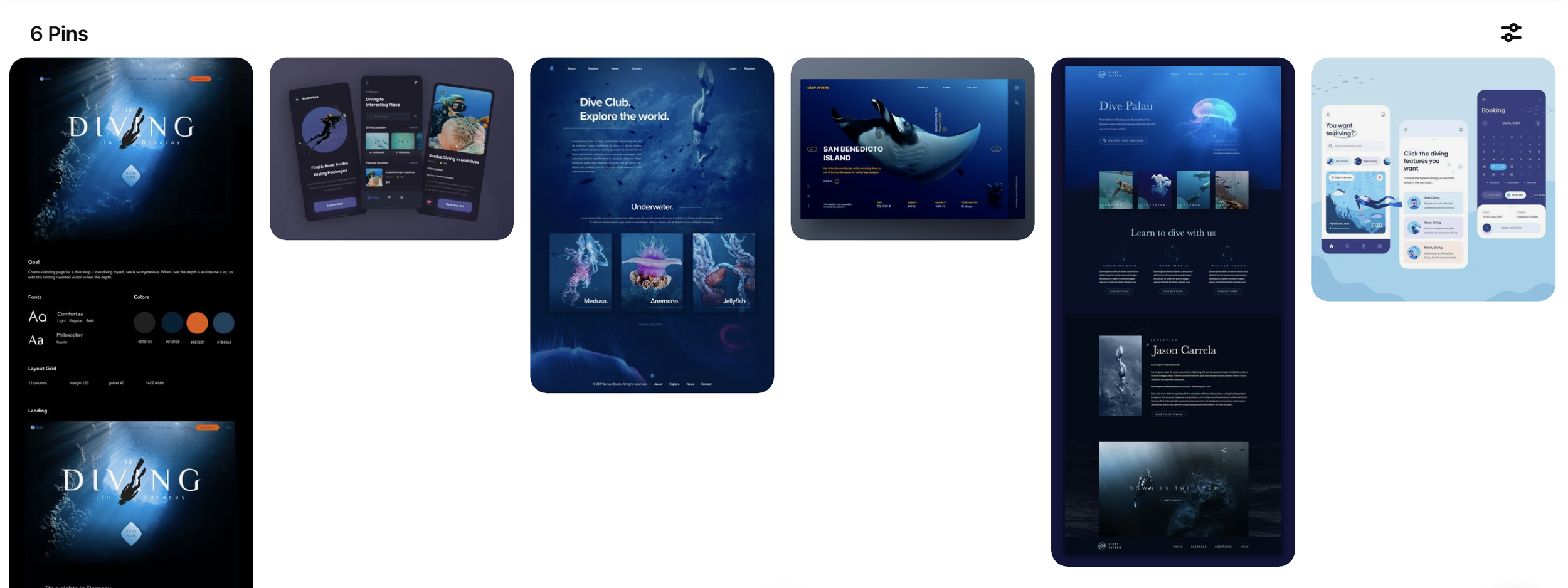 After making the wireframes, I started to look for design inspiration by creating a mood board. I used Pinterest to start looking for design inspiration and to understand color palettes that would be suitable for a diving demographic.