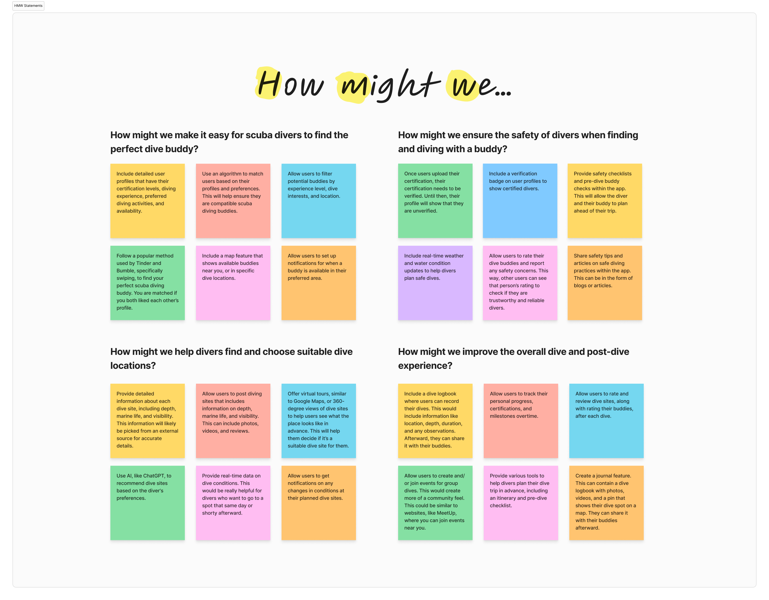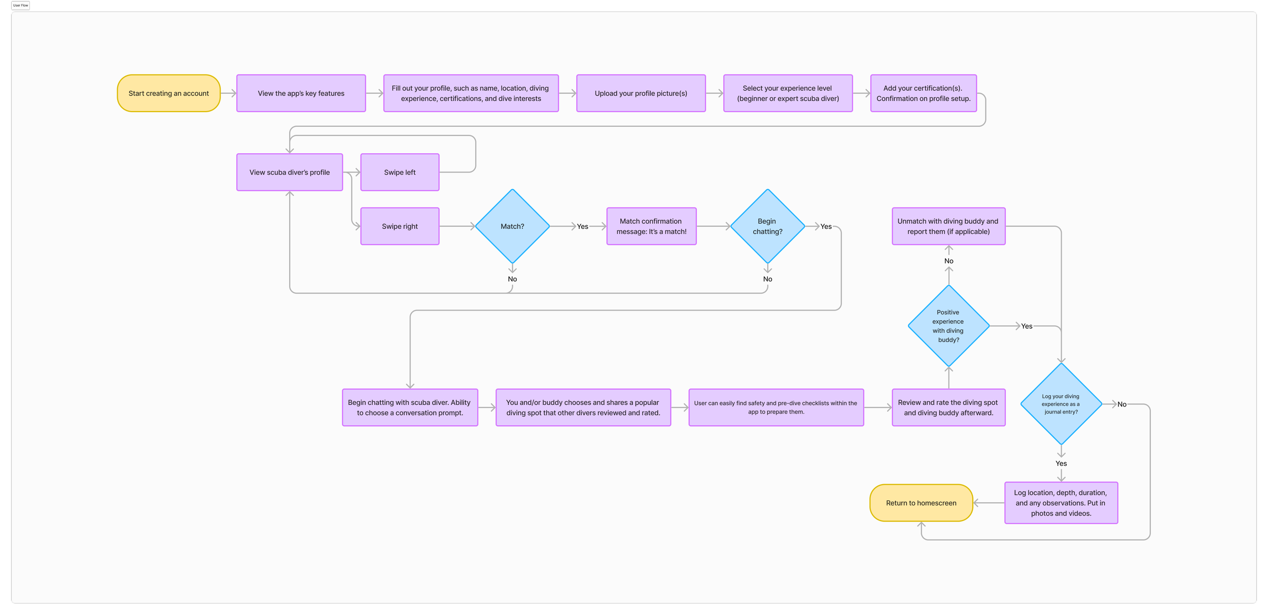 There were many challenges I wanted to address during the ideation phase, such as how to pair scuba buddies together, how to create a safe community within the app, and how to keep suitable scuba buddies matched. After coming up with a list of questions and various solutions, I decided to implement the following features: