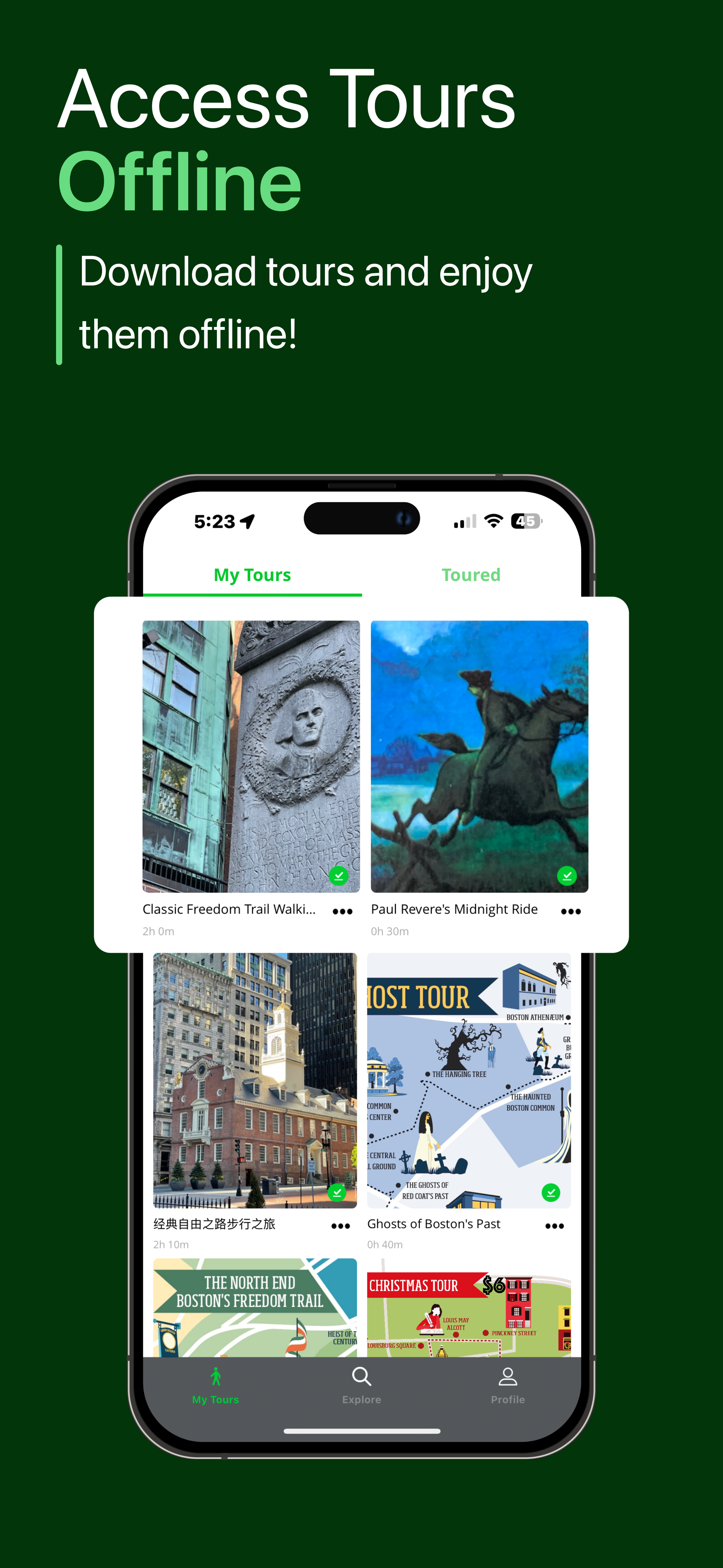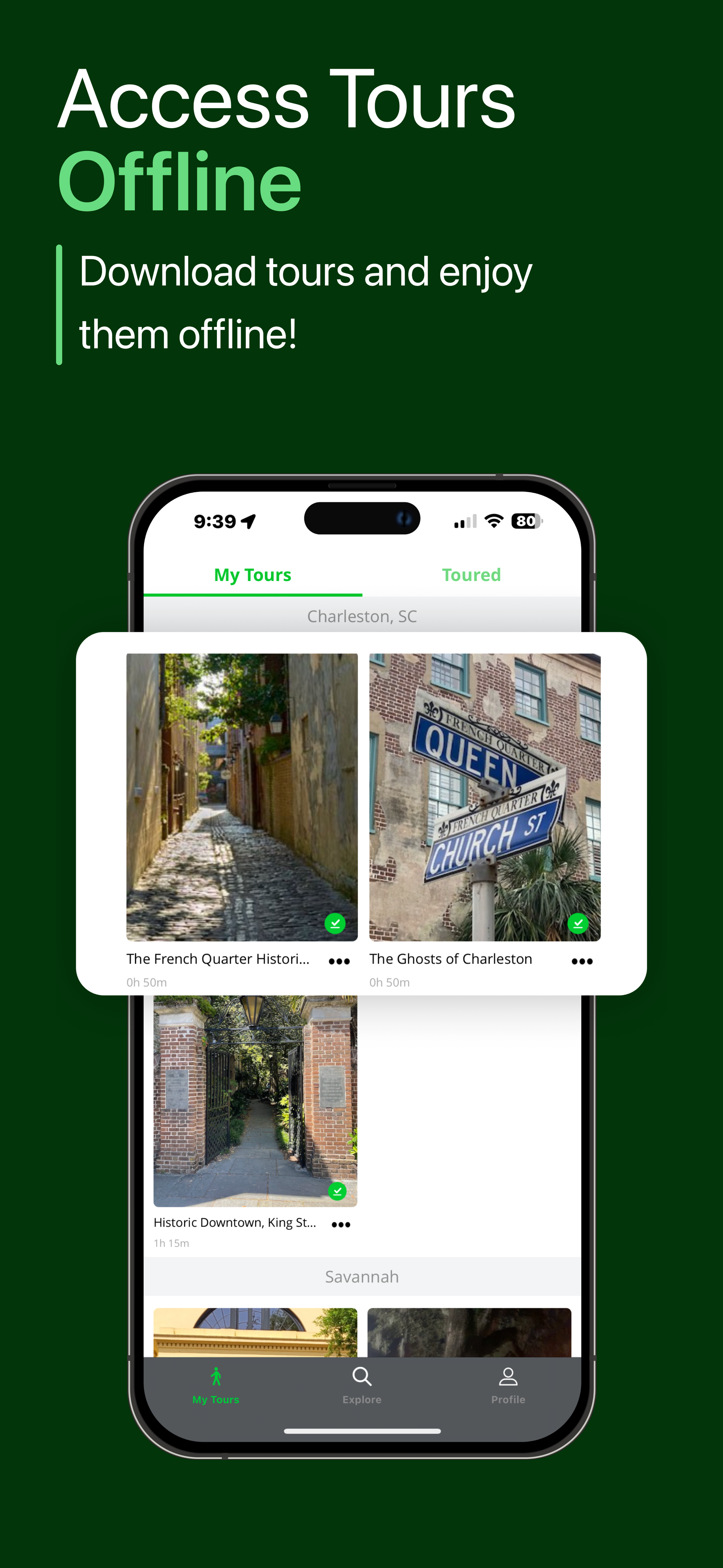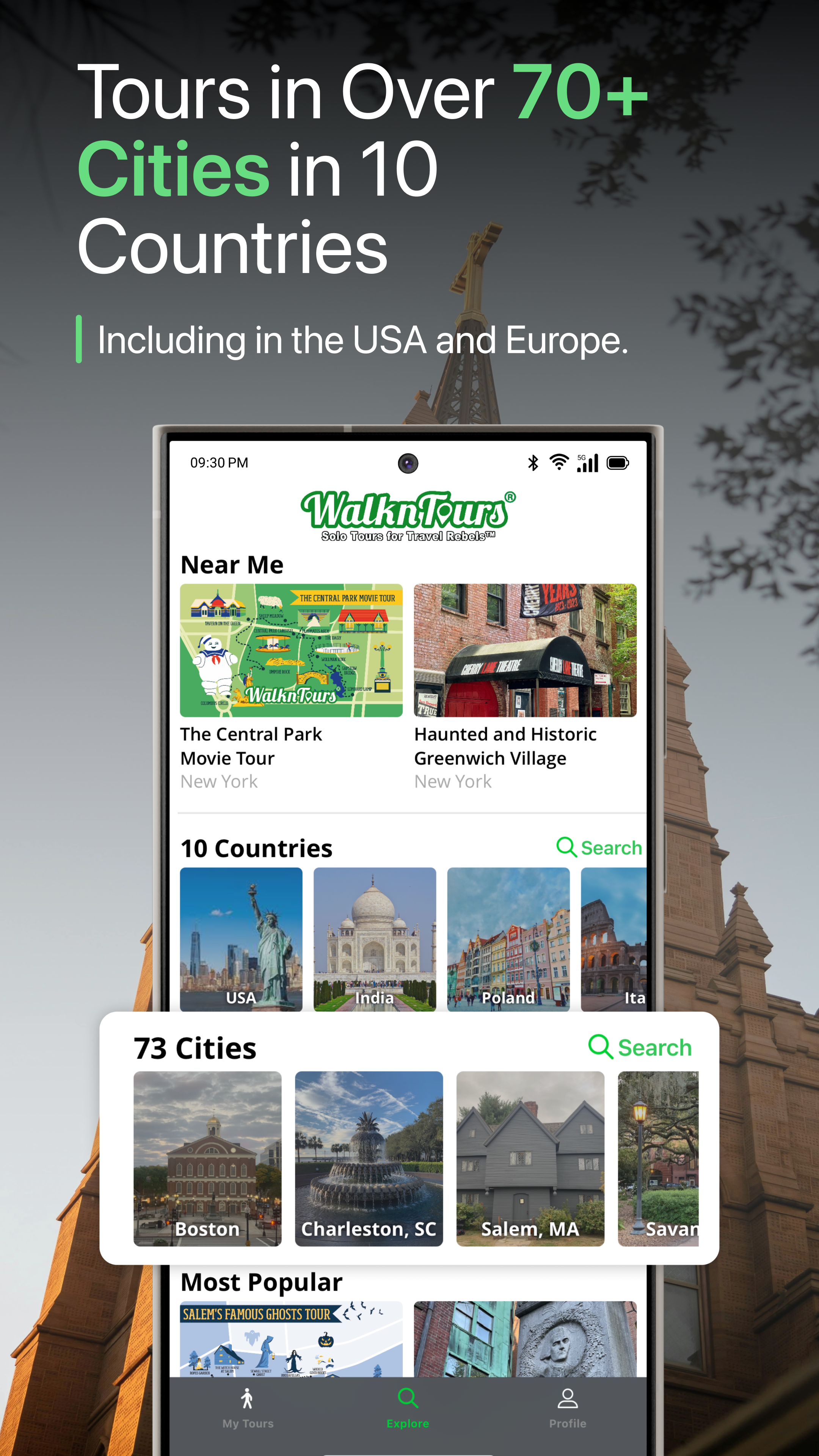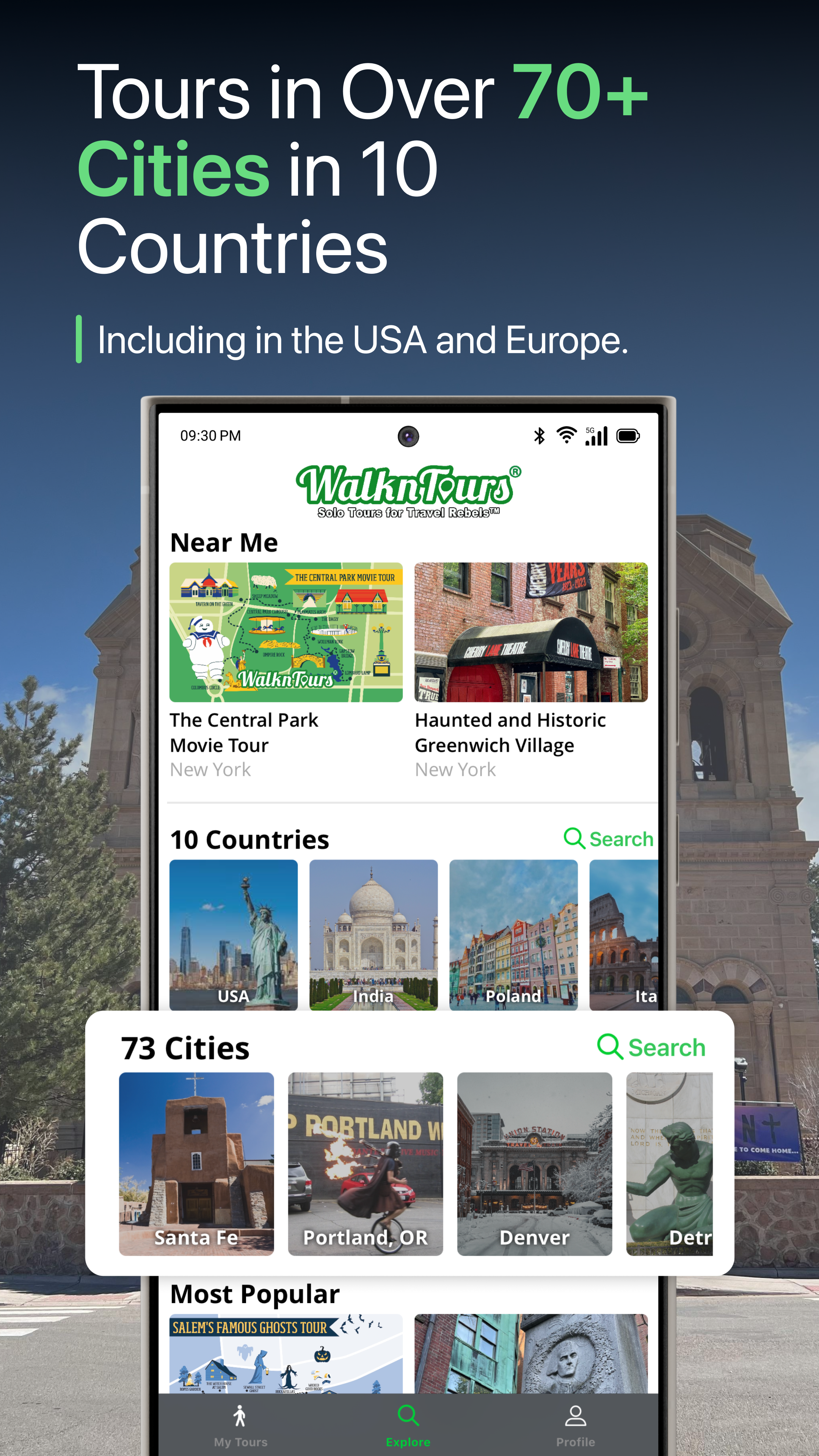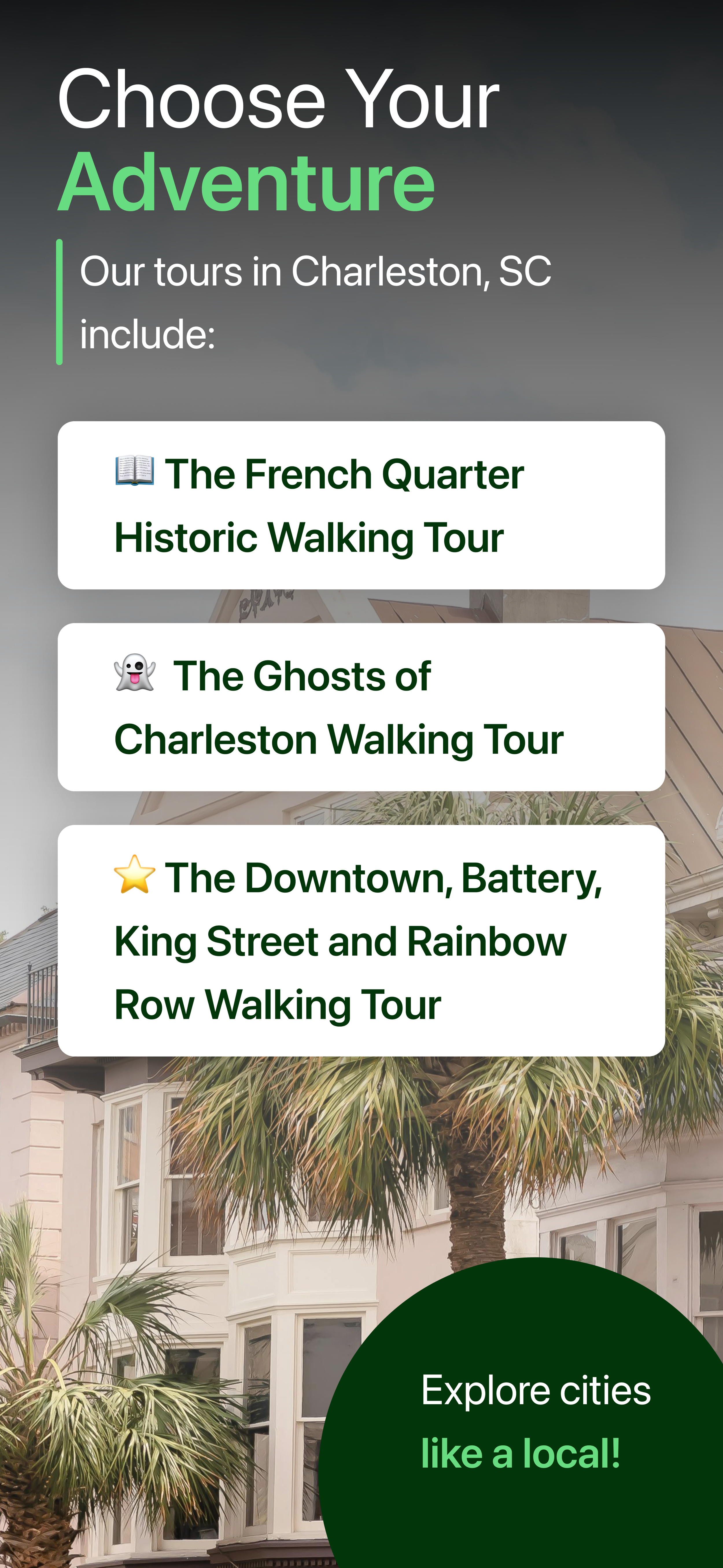 The owner of the walking tour app, WalknTours, wanted to refresh his app's screenshots for the App Store and Google Play Store to better promote its unique features. He requested three sets of screenshots. The first set targets a general audience and showcases the app's functionalities, like self-guided tours, access to tours in over 70 cities, and various tour types. The second and third sets are custom product pages designed for specific demographics in particular locations: Santa Fe and Charleston.